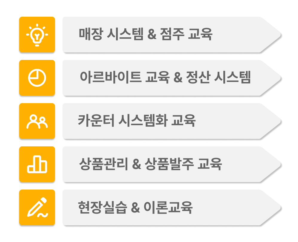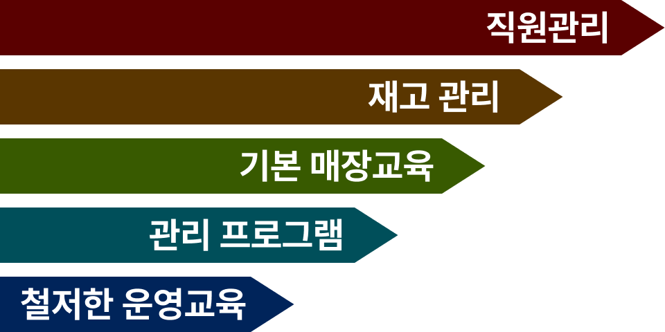 철저한 운영 교육, 관리프로그램, 기본 매장 교육 재고관리까지 매장의 매출 및 수익성 분석, 직원관리, 상권별 맞춤 홍보방안제시 등 전반적인 매장 운영을 도와드립니다. |